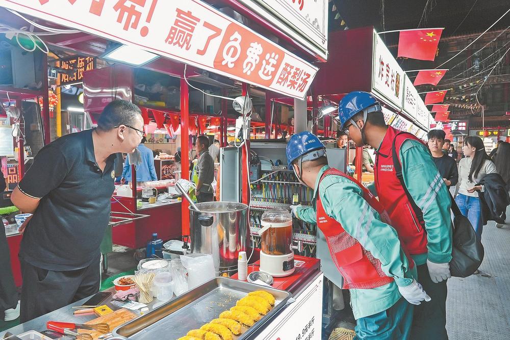 “附近商戶多,用電量大。風機箱和變壓器是檢查重點,測溫不能出錯?!?0月2日,山西太原供電公司青年突擊隊隊長毛輕揚在迎澤區(qū)鐘樓街開展用電檢查時,向隊員們強調注意事項。該公司團委組織青年突擊隊聯(lián)合黨員服務隊嚴密監(jiān)控景區(qū)、商業(yè)區(qū)等人員密集區(qū)域用電情況,及時發(fā)現(xiàn)并處置用電隱患。